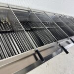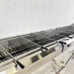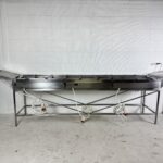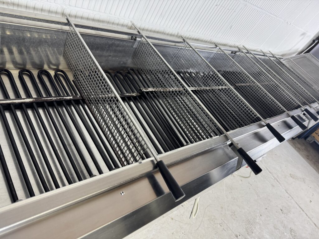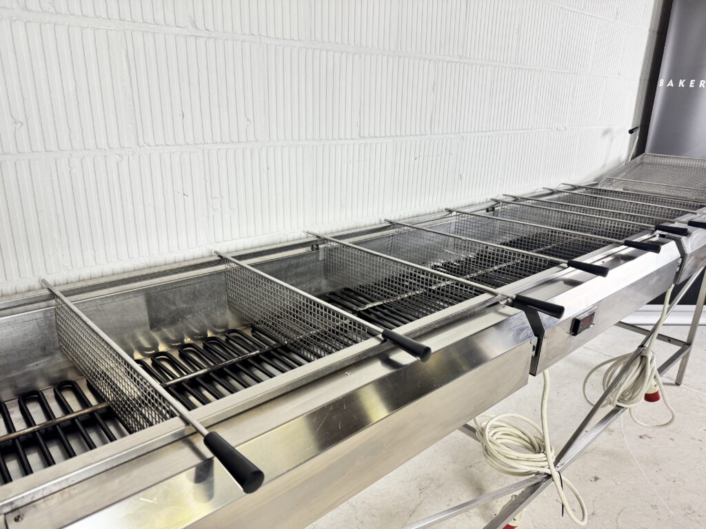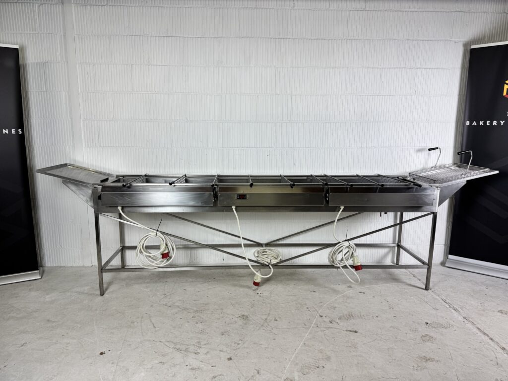 Deze oliebollenlijn met doorschuifsysteem is 2,8 meter lang. In RVS uitgevoerd en voorzien van een onderstel. De oliebollenbak is voorzien van een uitlektafel.