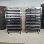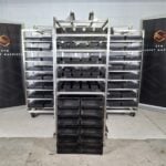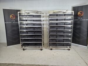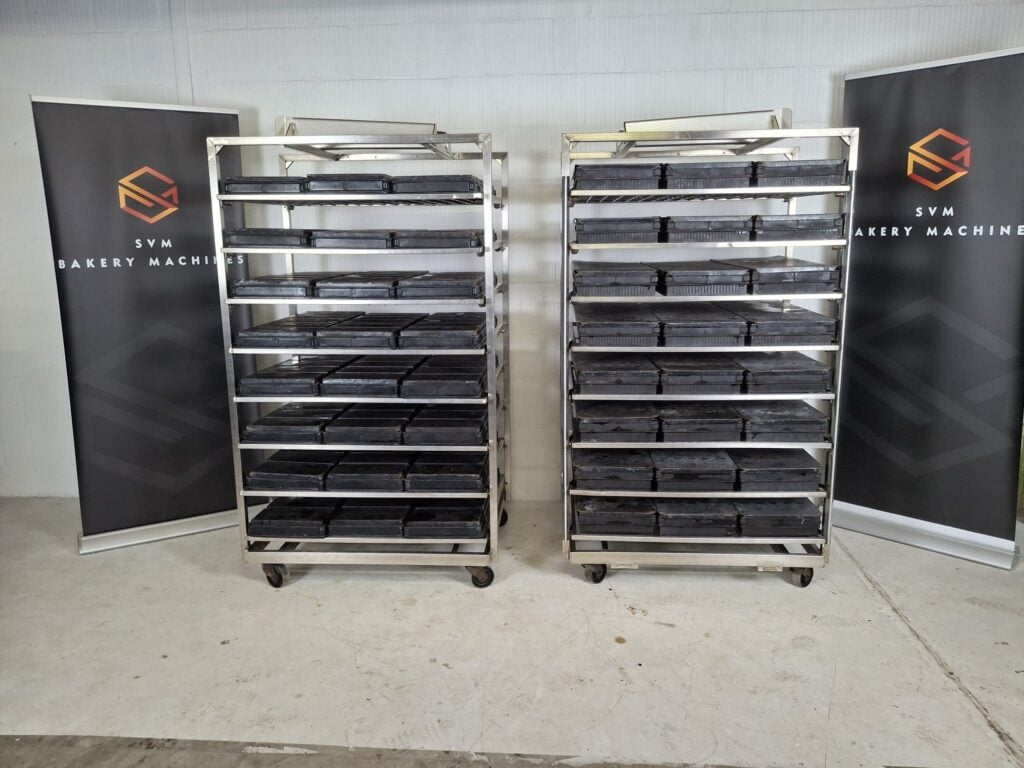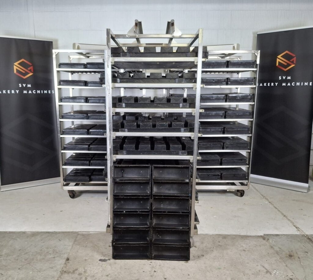 Deze Hein ovenwagen is geschikt voor de Rotatieovens van Hein. De wagen is voorzien van 8 rekken met spijlen. De afstand tussen de rekken is 17,5cm. De wagen is voorzien van een kopophanging. De wagen heeft een opening van 100×80cm. Kosten per wagen is €825, dit is inclusief broodblikken.