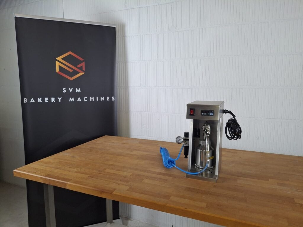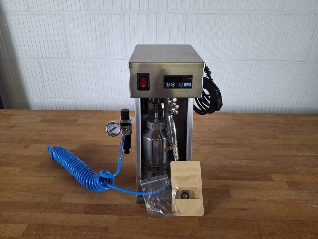 Dit showroommodel van de Choco Basic is een compacte chocolade spuitmachine en ideaal voor nauwkeurige en probleemloze verwerking van chocolade, coating of ganache. Uitgerust met een speciaal lage druk spuitpistool met onderbeker, een warmhoud-unit en een spuitdruk regelaar, biedt deze machine een constante verwerkingstemperatuur en is altijd gebruiksklaar. Dankzij het handzame tafelmodel is de machine eenvoudig te bedienen en te reinigen.