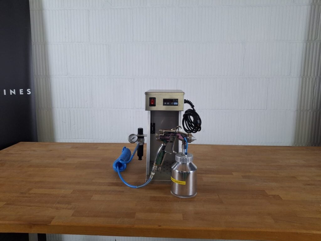 De machine is veelzijdig in gebruik, met instelbare spuitbeelden voor dunne lagen, spetteren, fluweelafwerkingen en motieven. De temperatuurinstelling is begrensd tussen 20°C en 50°C, met een geadviseerde werktemperatuur tussen 30°C en 42°C voor optimale resultaten. Deze spuitmachine wordt geleverd zonder compressor, en vereist een compressor met een minimale capaciteit van 60 liter per minuut voor aansluiting. Perfect voor professionele chocolatiers en banketbakkers.